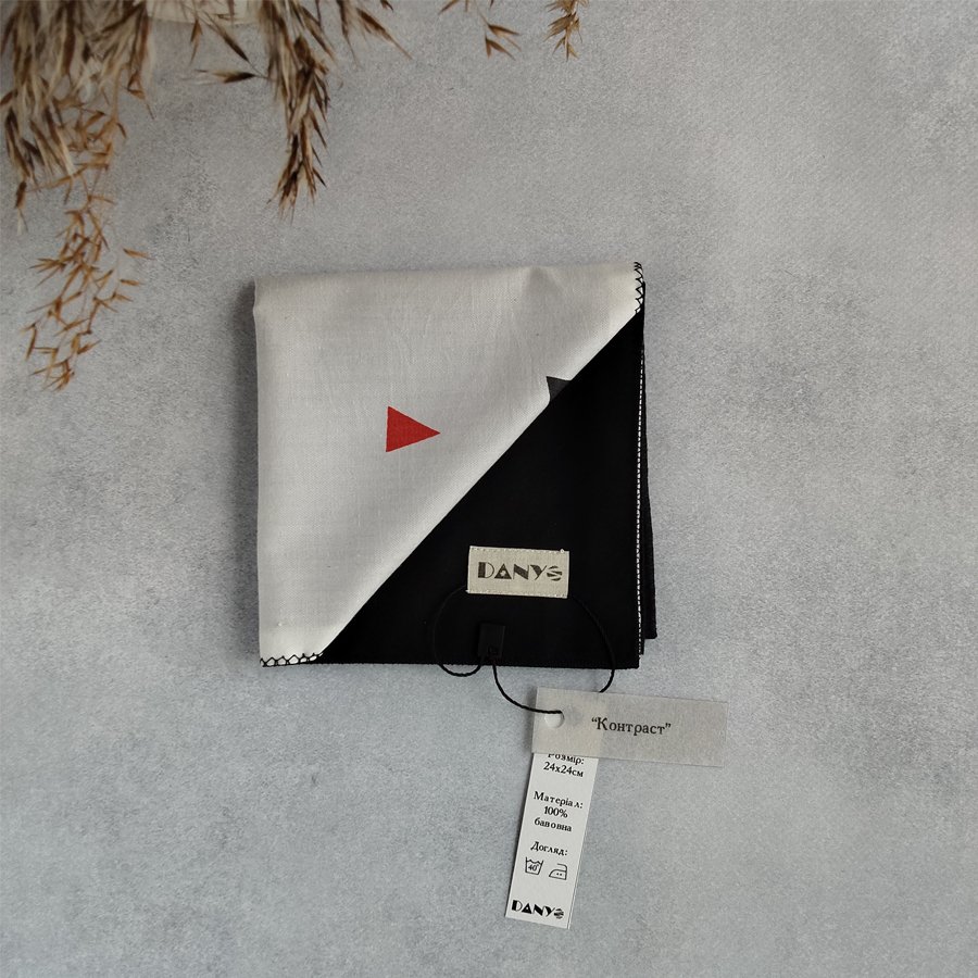 Двосторонній, ручної роботи, з продуманим розміром, що дозволяє складати носовичок у різний спосіб – від класичного до виразного.